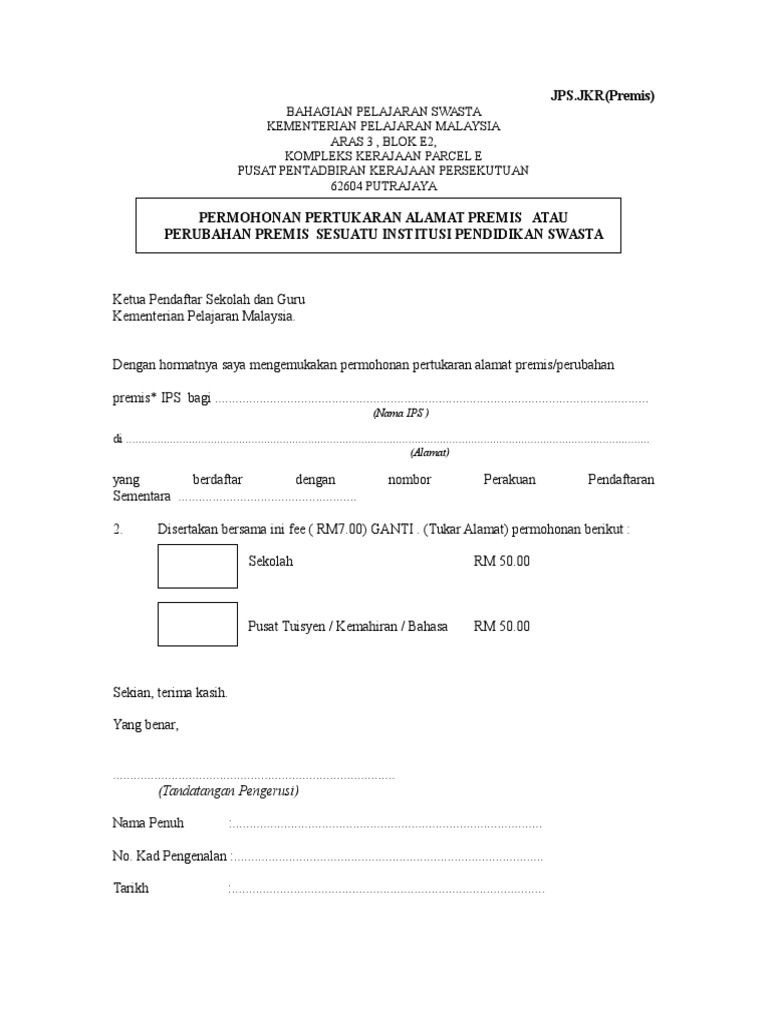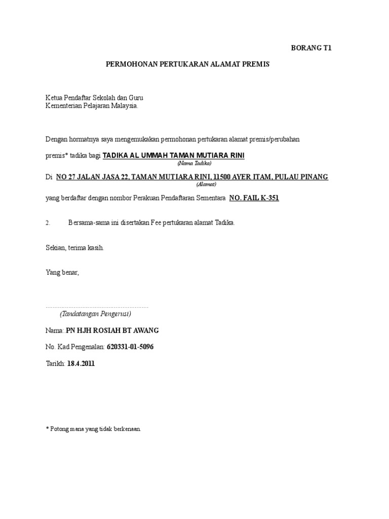 Borang Mohon Tukar Alamat Premis Tadika Pdf