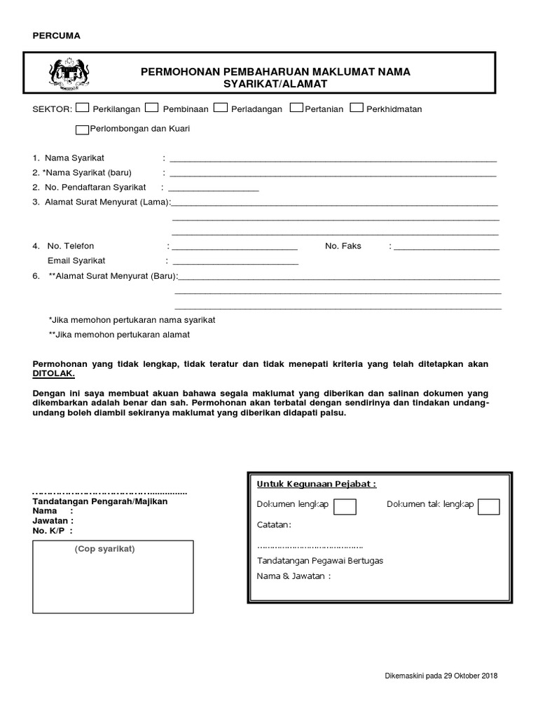 Permohonan Pertukaran Nama Dan Alamat Syarikat Borang Dan Senarai Semak Pdf